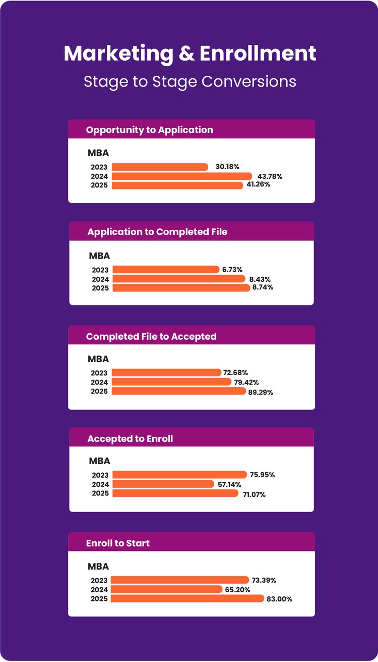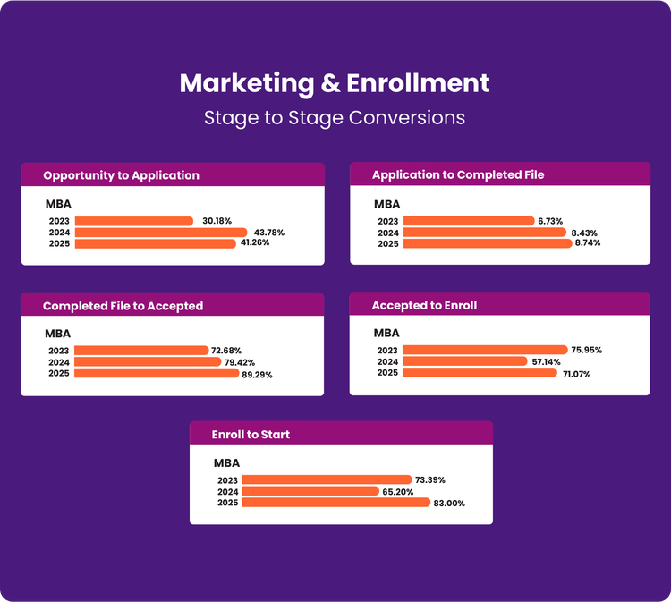 Challenges can occur at every stage in the student journey. From inquiry to application, we share transparent data with our partners and work together to overcome enrollment hurdles.